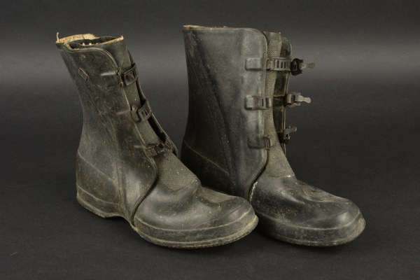 Overshoes. Paire homogène en caoutchouc noir. Trois crochets de fermeture...