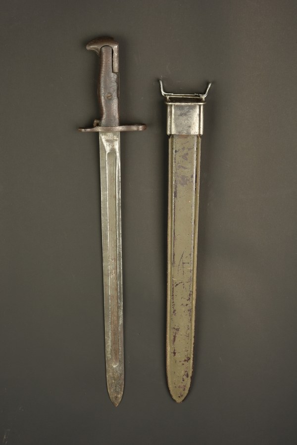 Baïonnette de Garand. Modèle long. Plaquettes en bois. Les garnitures..