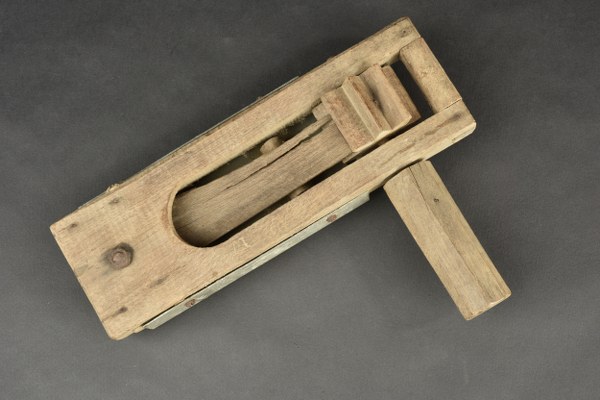 Crécelle anti-gaz. Fabrication en bois et métal. Fonctionnelle. La lamelle..