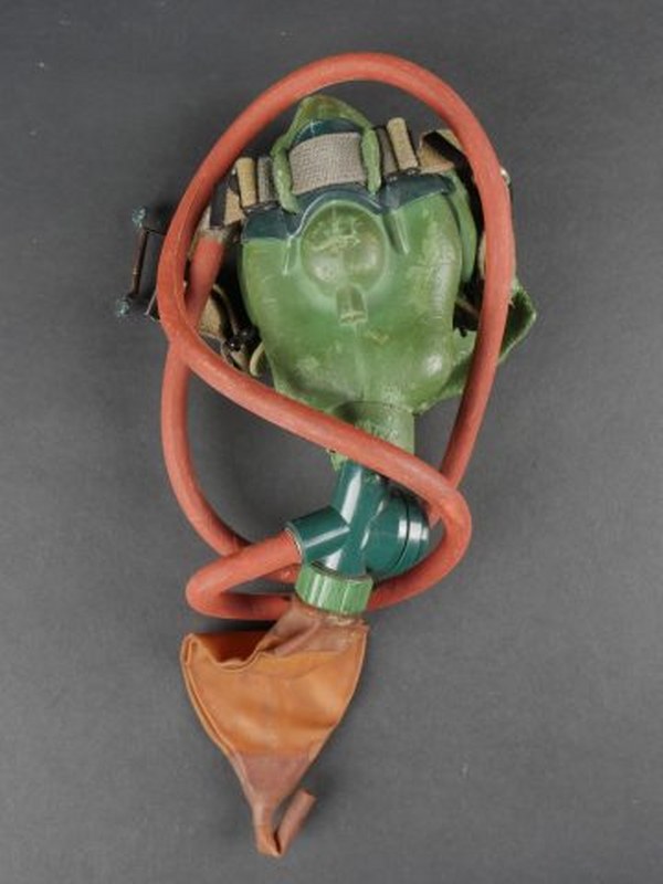 Masque à oxygène. En caoutchouc vert, sans marquages visibles. Certaines..