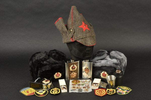 Lot russe. Comprenant trois modèles différents de coiffure. 14 insignes..