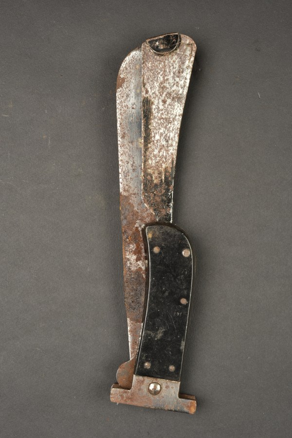 Machette britannique. Plaquettes en bakélite noire. Lame pliante. Fortement oxydée...