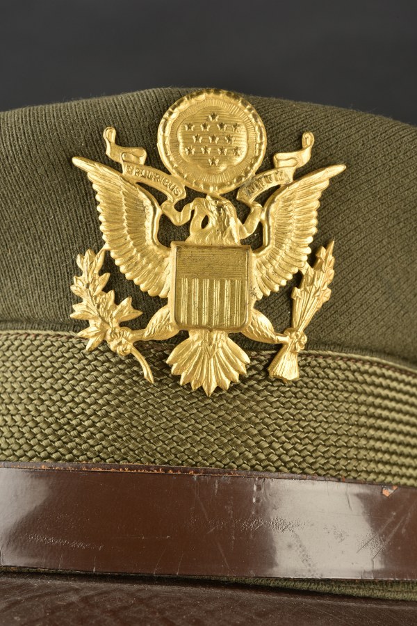 Casquette d'officier US. En drap couleur chocolat. Insigne d'officier en..