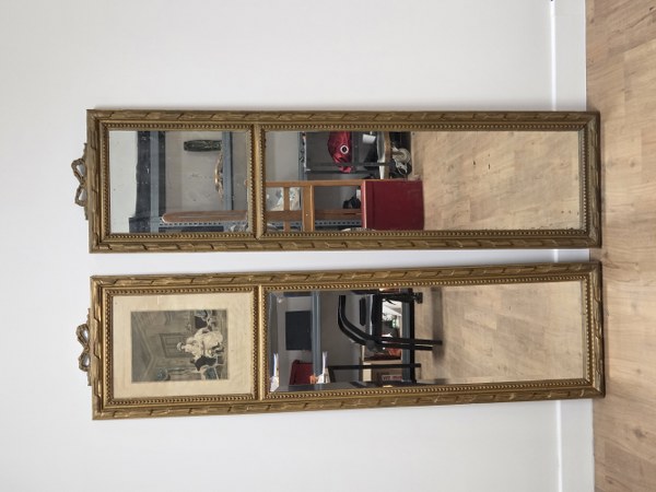 Paire de trumeaux en bois doré, l'un agrémenté d'une gravure.