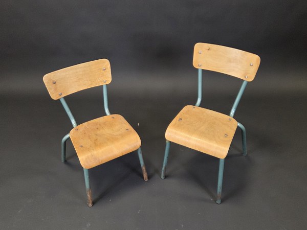 Deux petites chaises d'enfant à structure métallique verte et dossier..