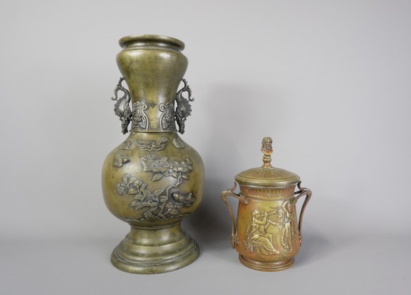 Vase en métal de style asiatique à décor d'oiseaux et..