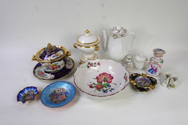 Ensemble d'objets en porcelaine comprenant une soupière, une cafetière, un..