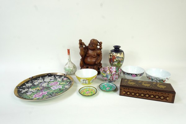 Ensemble d'objets asiatiques comprenant notamment quatre bols, une assiette, un..