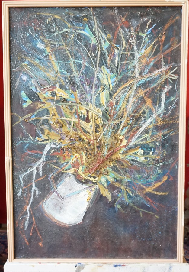 Ecole du XXème siècle. Bouquet de fleurs stylisé. Huile sur..