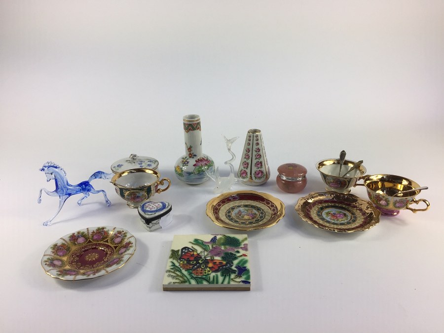 Assiette, assiette avec centre accidentée, moutardier métal, pichet, tasse et..