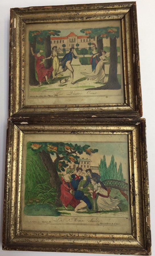 Deux gravures en couleur '' la main chaude, les quatres..