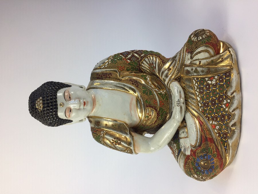 JAPON. Bouddha en faïence de Satsuma représenté en position de..