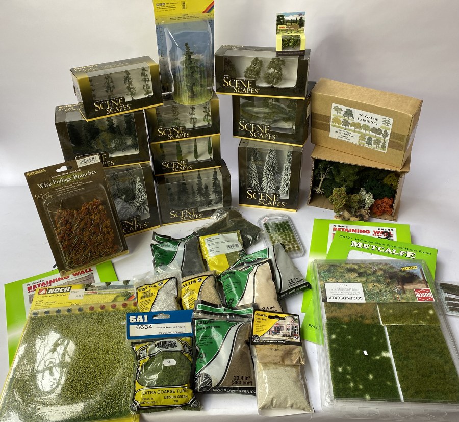 Scene scapes, etc... Écartement N, – lot de maquettes décors arbres, matériaux, ballast, talus, etc..., NB