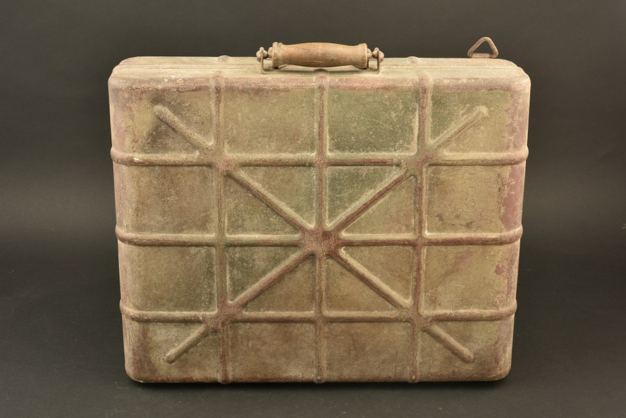 Gourde grande capacité. Gourde en aluminium, nombreuses bosses. Marquages illisibles...
