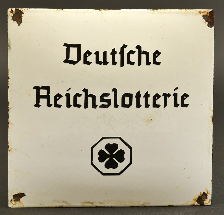 Plaque Deutsche Reichslotterie. En métal émaillé blanc. Bombée. Inscription en..