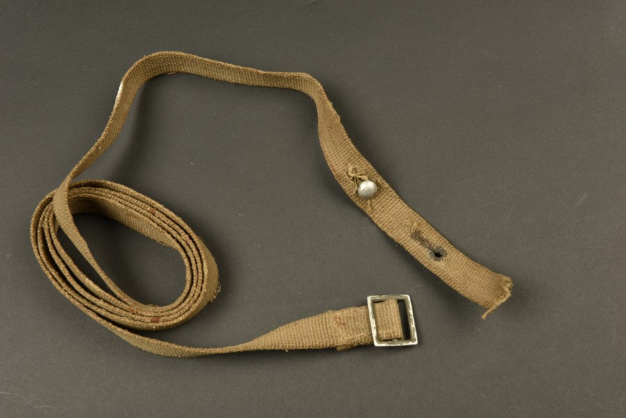 Sangle de masque anti-gaz allemand. En toile feldgrau, bouclerie complète...