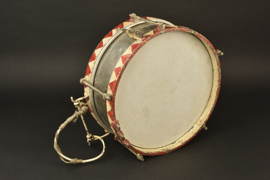 Tambour HJ. En bois et métal. Peinture rouge et blanche..