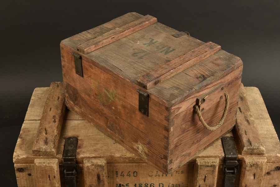 Caisses à munitions française et équipement. Comprenant une caisse en..