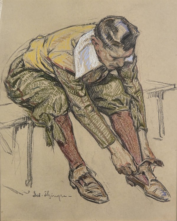 Édouard ELZINGRE (1880-1966). Homme se chaussant. Sans titre, fusain et..
