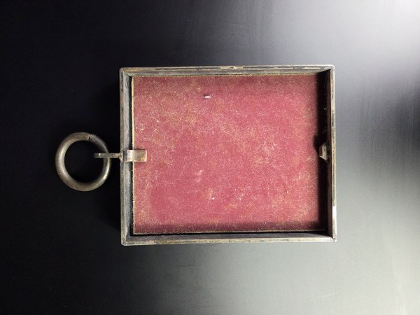Miroir rectangulaire en épais métal brut, surmonté d'un anneau. Travail..