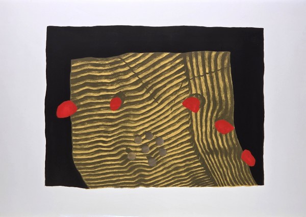 Travail moderne. Abstraction aux points rouges. Lithographie non signée, encadrée...