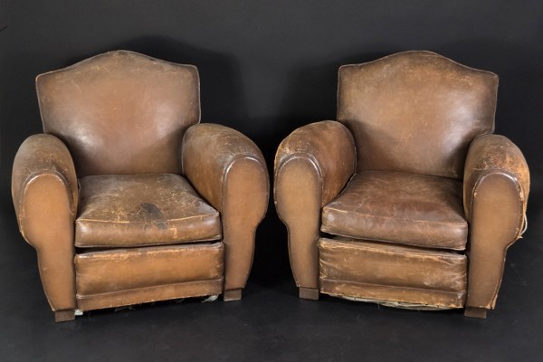 Paire de fauteuils club en bois et cuir havane, dossier..