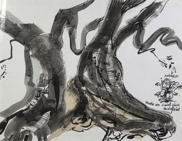 Michel FREROT (1927-2016). L'olivier. Encre sur papier signée. Encadrée 59..